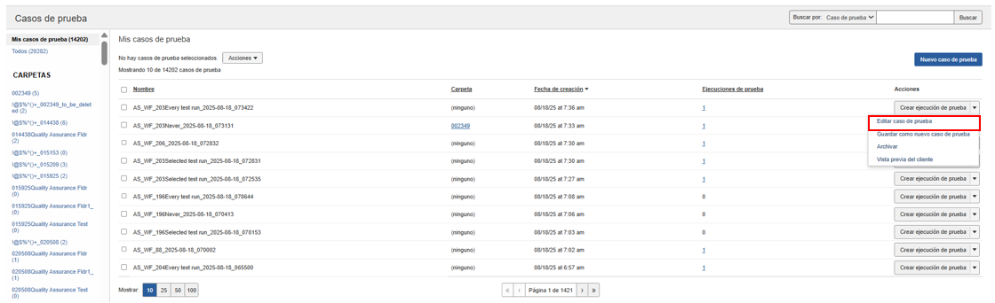 Para realizar cambios en un caso de prueba existente, siga este procedimiento. Cualquier enlace de Caso de prueba en la pantalla Casos de prueba lo lleva a una pantalla Editar caso de prueba, que es una pantalla de tres paneles similar a las pantallas de creación de un nuevo caso de prueba. El mismo enlace Nombre del caso de prueba se muestra en la columna Caso de prueba de la pantalla Ejecuciones de prueba.