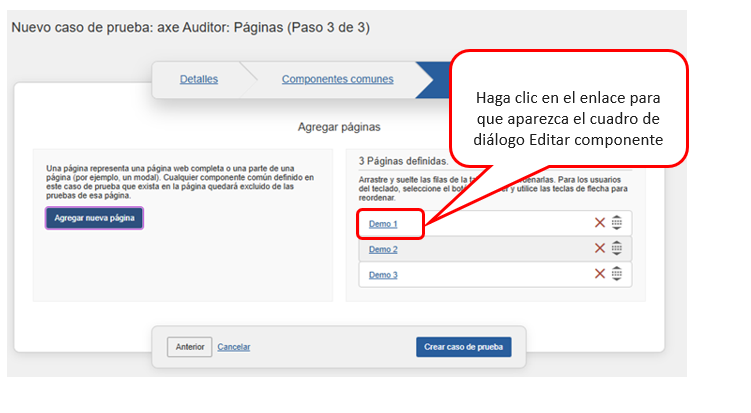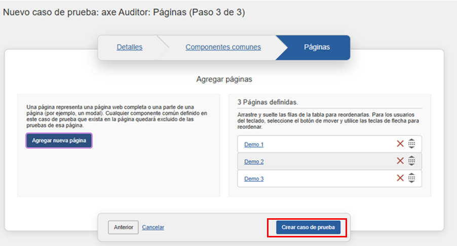 Aparece la pantalla Editar caso de prueba: Detalles (Paso 1 de 3), con el panel Detalles mostrado inicialmente de manera predeterminada. Ahora puede editar los valores de campo existentes modificando las entradas de texto y las selecciones de menú en cada panel. Luego, en el panel Páginas, haga clic en el botón Guardar caso de prueba para guardar las ediciones que realice.