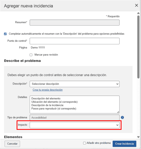 Agregar nuevo problema (campo desplegable Impacto deshabilitado)