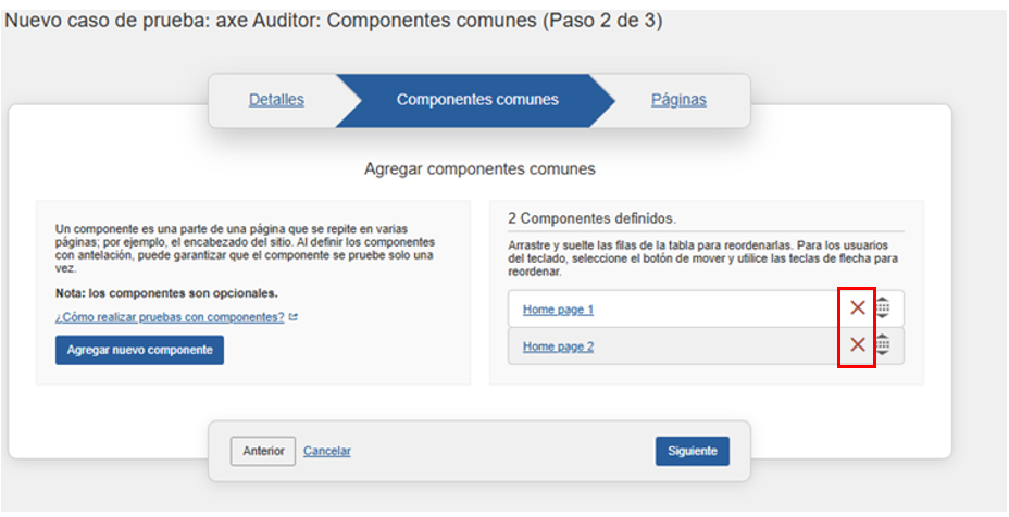 La eliminación de un componente de un caso de prueba se realiza activando el botón X rojo a la derecha del componente que desea eliminar dentro de la tabla Componentes definidos en el panel Componentes comunes. # Esto se puede hacer en un componente agregado previamente al crear un nuevo caso de prueba o al editar un caso de prueba creado previamente. Para obtener más información sobre el punto de partida de este procedimiento, consulte Creación de un nuevo caso de prueba o Edición de un caso de prueba.