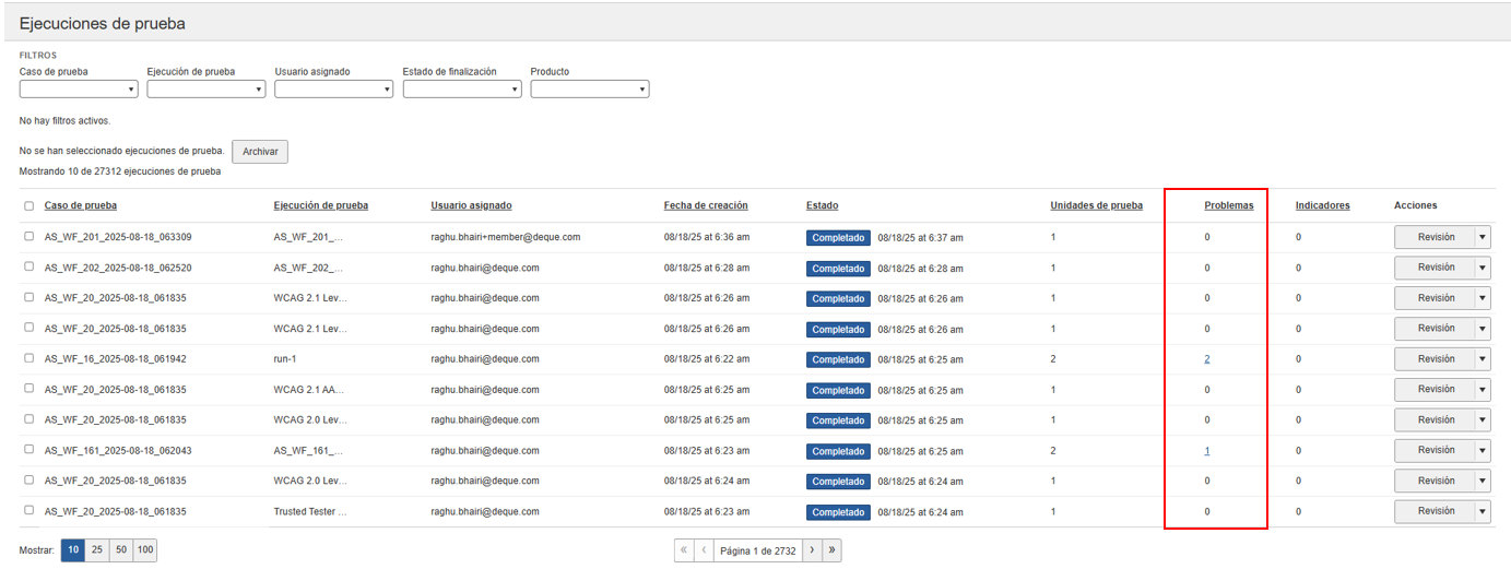 Acceso a problemas desde la pantalla de descripción general de ejecuciones de pruebas