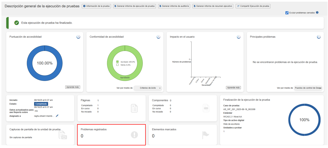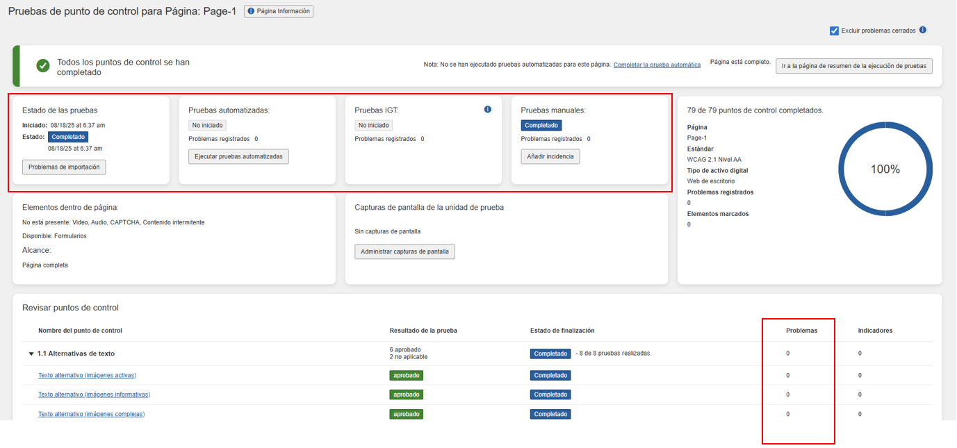 Problemas automatizados (problemas registrados como resultado de pruebas automatizadas para la página en prueba: todos los puntos de verificación)
