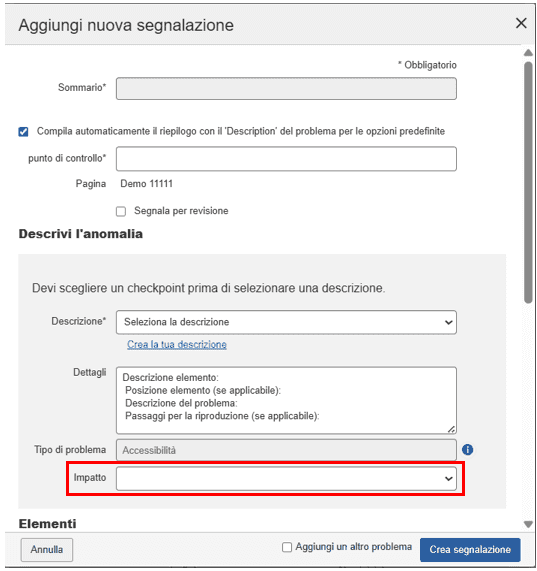 - Eccezione: se un utente sceglie di aggiungere una descrizione personalizzata del problema, il campo Impatto verrà automaticamente abilitato in modo da poter assegnare la gravità appropriata al problema personalizzato.