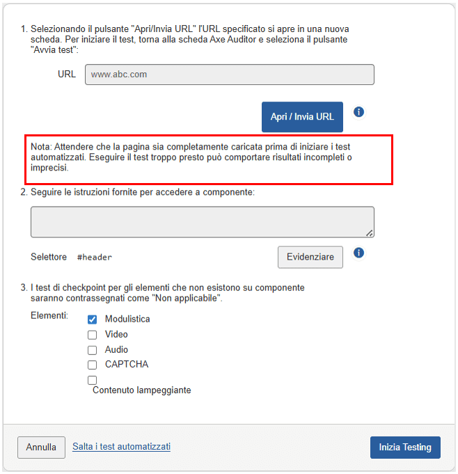 Abbiamo aggiunto un'istruzione chiara nella pagina "Salta test automatici" che ricorda agli utenti di eseguire i test automatici solo dopo che tutti gli elementi della pagina sono stati caricati completamente. Questo contribuisce a migliorare l'affidabilità e la completezza dei risultati dei test automatici.