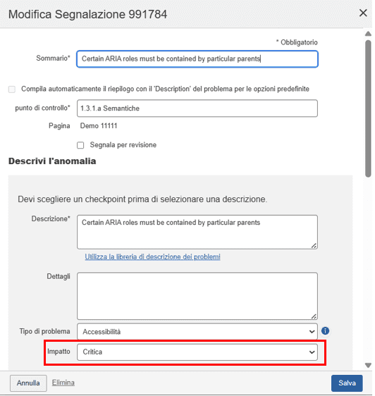 Solo gli utenti amministratori possono modificare il livello di gravità (Bloccante, Critico, Grave, Moderato, Minore).