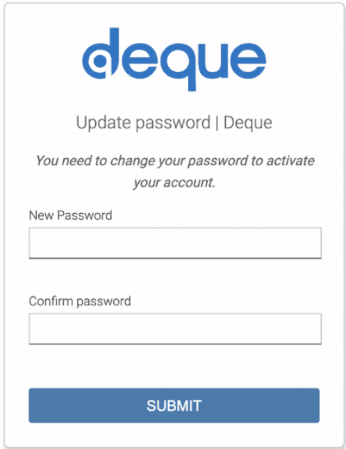 組織内のシステム管理者(または多くの場合、Deque管理担当者)によってaxe Auditorを利用するための新しいアカウントが作成されると、ユーザー名とパスワードが設定されます。ただし、これらの資格情報で初めてサインインする際に、パスワードのリセットやその他の操作を求められる場合があります。これは管理者の裁量によります。
