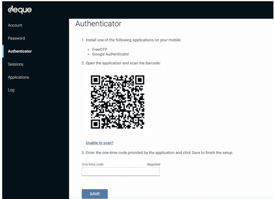 1.FreeOTPまたはGoogle Authenticatorのいずれかをスマートフォンにインストールしてください。 2.認証ページにキーコードとバーコードが表示されている状態で(例えばノートパソコンのウェブブラウザ上など)、スマートフォンの認証アプリを使ってバーコードをスキャンするか、キーコードを手動でアプリに入力して設定を進めてください。 3.その後、モバイル認証アプリが表示するワンタイムコードを、axe AuditorのAuthenticator画面の対応する入力欄に入力します。 4.「保存」ボタンをクリックすると、ワンタイムコードの入力内容が保存され、2要素認証が有効になります。