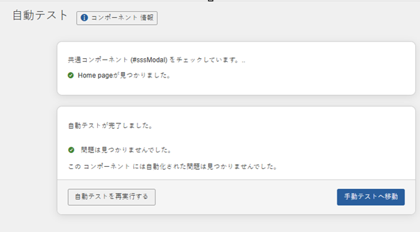 問題が検出され、自動テストが完了した場合:アクセス方法 自動テスト結果画面は、ボタンを有効化することで表示されます。 自動テスト画面。自動テストが実行された後、自動テスト画面が更新され、完了を示すメッセージが表示されます。 オートメーテッドテスト画面が更新され、完了を示すメッセージが表示されます。 見つかった問題の数。手動テストへのリンクと《手動結果に移動》ボタンが表示されます。 《手動結果に移動》ボタンが表示されます。