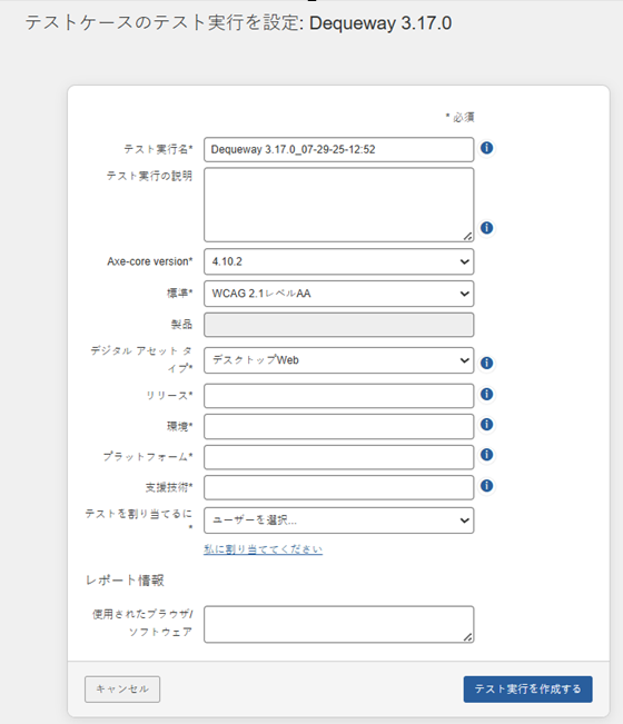 -   **テスト実行の説明**: このフィールドには、テストの詳細(実施日、ページやセクションごとのテスト範囲、テストに使用したビューポート設定、テスターが必要とするその他の情報など)を記載してください。