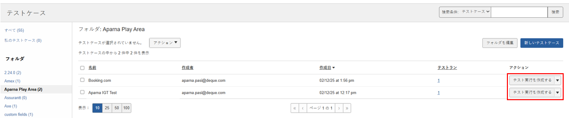 1.テストケース画面で、該当するテストケースの行の「アクション」列にある**「テスト実行の作成」**ボタンをクリックします。 テスト実行の作成ボタン