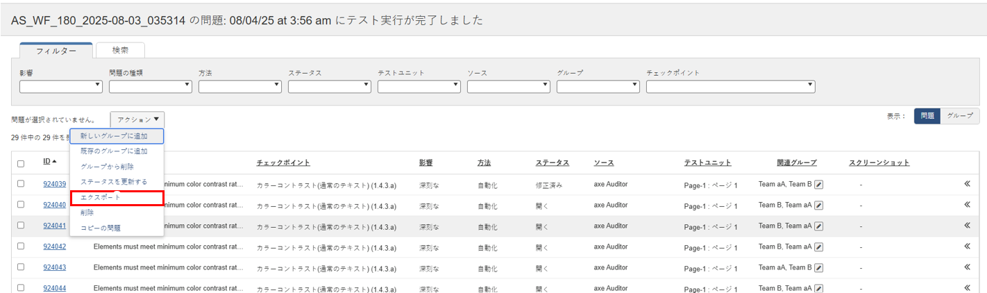 | 課題の発生元 | 問題の発生源。ユーザーが複数のソースから問題をインポートできるため、この列は問題の発生元を記録します。可能な値は「axe Auditor」、「axe Dev Tools Extension」、「axe Dev Tools Mobile」です。