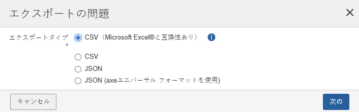 • JSON(axe(アックス)ユニバーサルフォーマット準拠): さまざまなaxe(アックス)製品間で共有されるユニバーサルエクスポートフォーマットに準拠したJSON形式。これは、共通のビジネス分析プラットフォームでの利用など、さらなる処理のために複数のaxe(アックス)製品からデータを抽出する必要がある場合に特に便利です。