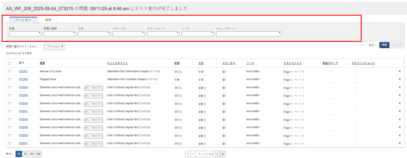 • 問題タイプフィルターとチェックポイントフィルターは静的で、あらかじめ設定されており、テーブルの列には対応していません。