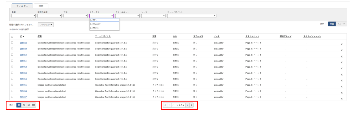 問題一覧画面には、特定のテスト実行で記録された問題に関する関連情報の列が表形式で表示され、結果を簡単に把握できるようになっています。任意の画面の問題にアクセスした後、表示される情報を管理する方法がいくつかあります。 ユーザーインターフェースで利用可能なツールを使って表示内容を制御できます。