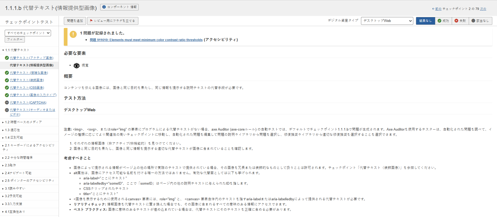 • 「不合格」:赤いXアイコンでマークされます。まず、追加する必要があります。 テストを不合格にしてしまうアクセシビリティの問題詳細については、[リンク]をご参照ください。 [問題の追加] [(チェックポイント固有)](adding-an-issue-(checkpoint-specific))。