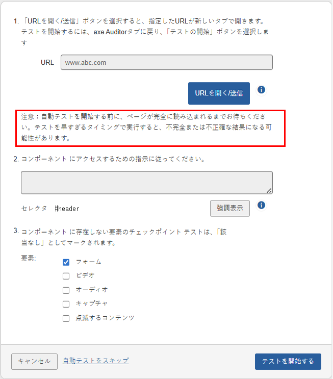 自動テストをスキップページに、すべてのページ要素が完全に読み込まれた後にのみ自動テストを実行するよう、ユーザーに注意喚起する明確な案内を追加しました。これにより、自動テスト結果の信頼性と網羅性が向上します。