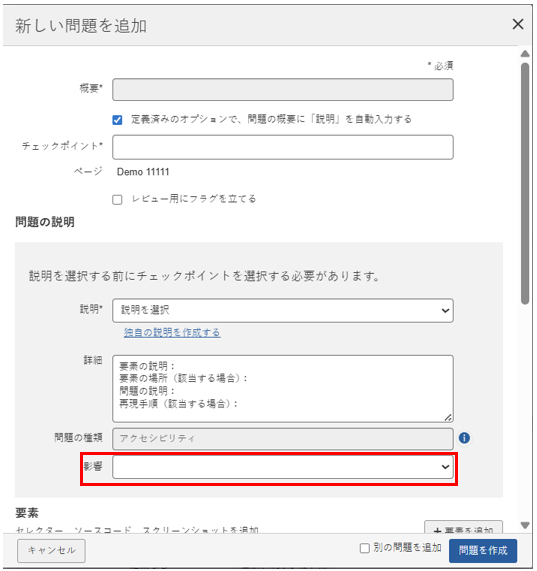 新しい問題を追加(Impact ドロップダウンフィールド無効)