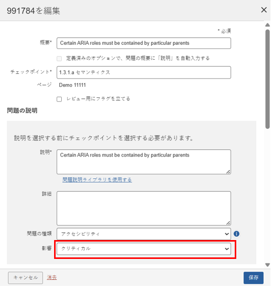 • メンバーユーザーは、問題を追加および問題を編集**ページの両方で I影響度 のドロップダウンが無効になります。