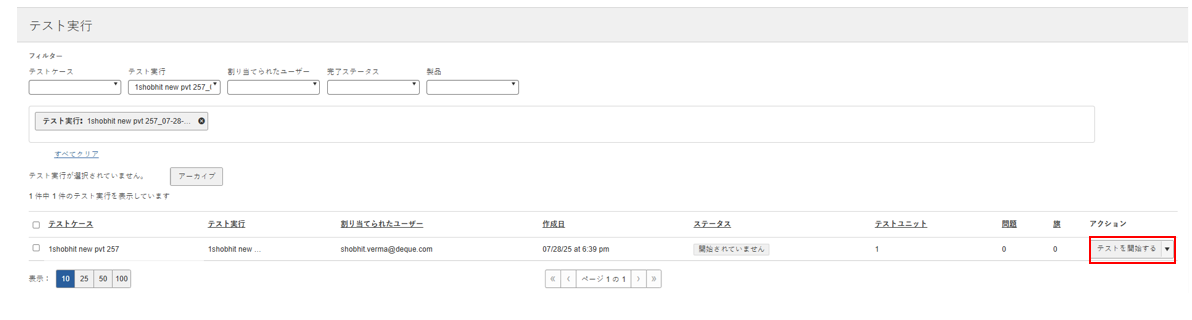 **注記**:[Actions]列には、[Status]列が「未開始」状態を表示している場合にのみ[テスト開始]ボタンが表示されます。これは通常、作成されてユーザーに割り当てられた新しいテスト実行を指しますが、その個々のコンポーネントやページのテストはまだ開始されていません。