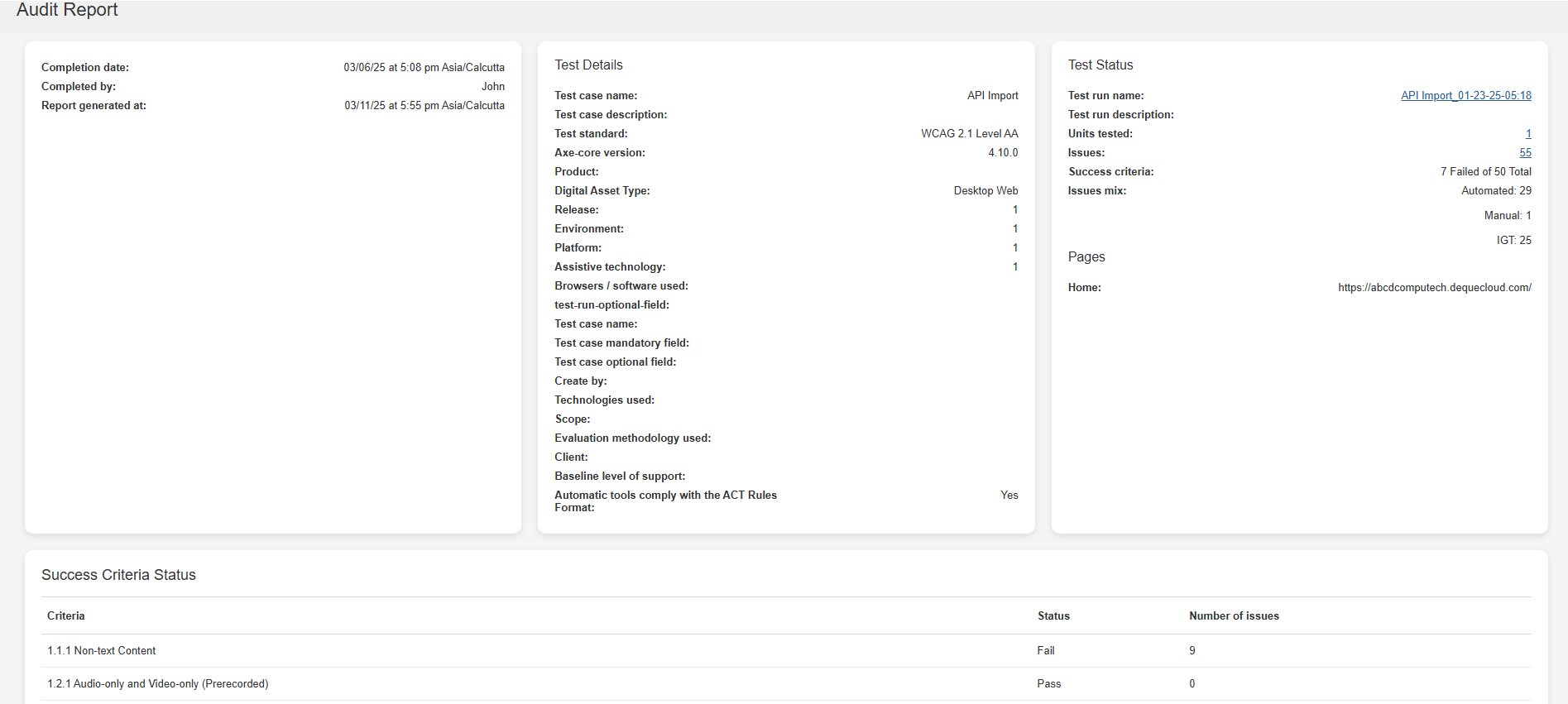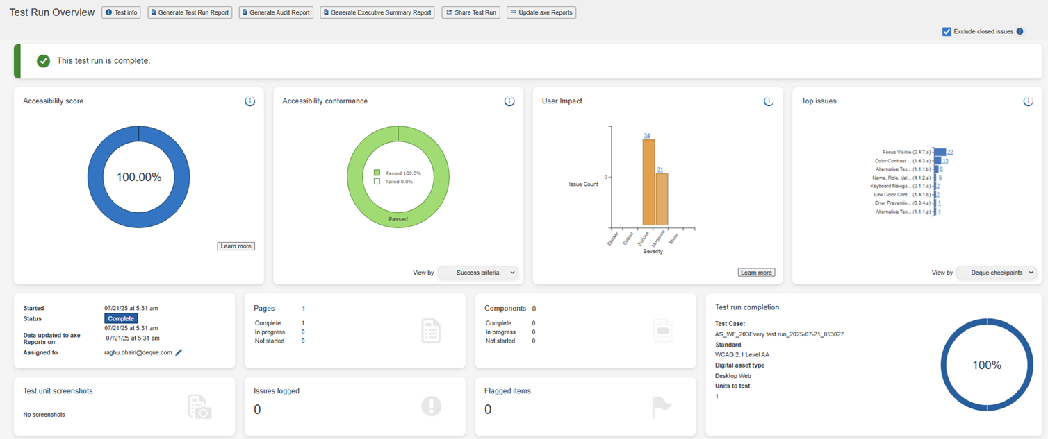 Update axe Reports: On completion of a test run, axe Auditor seamlessly transmits the latest data to axe Reports, and a success message appears on the Test Run Overview page. You can use the Update axe Reports button to ensure that axe Reports receives the most recent information whenever you modify the test run.