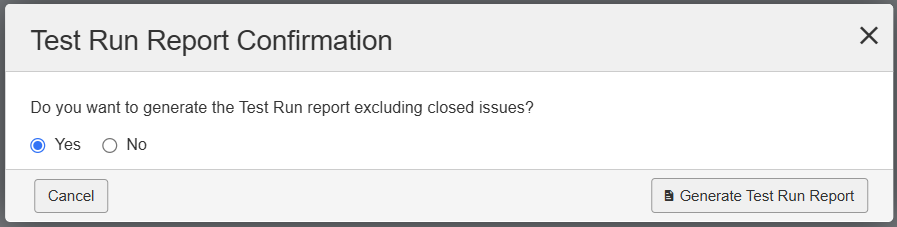 Generate Test Run Report button: Use the button to view and print an HTML report for completed test runs. Clicking the Generate Test Run Report button brings up a confirmation dialog box where you decide whether to generate the report with or without closed issues.