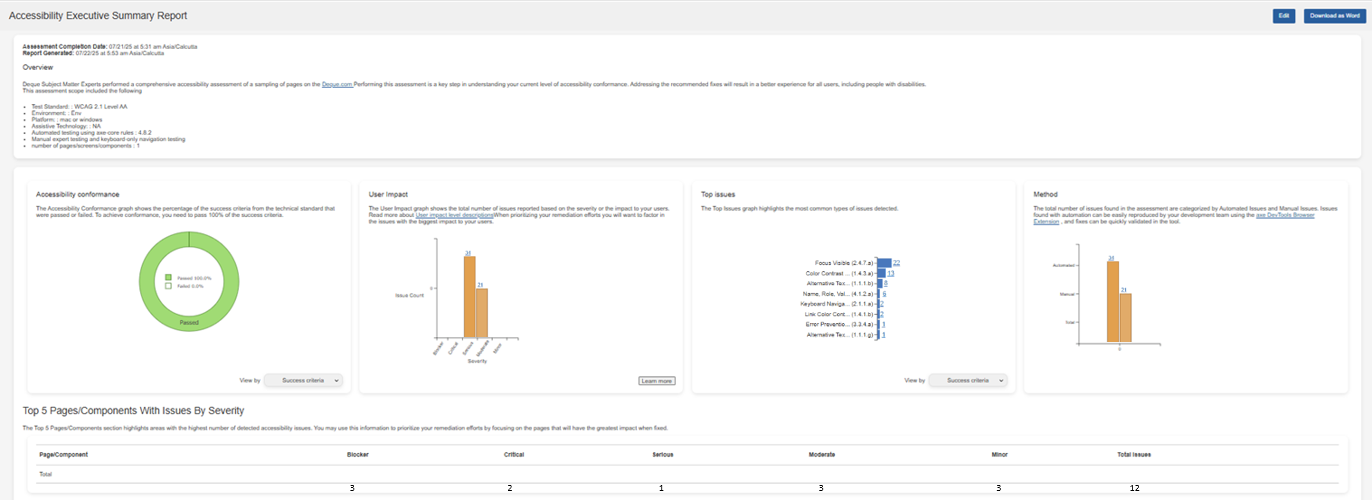 - Generate Executive Summary Report: This report provides a high-level summary of the most significant accessibility issues identified during an assessment. It highlights the top five affected pages or components based on the severity (Blocker, Critical, Serious, Moderate, and Minor). The Total Issues column reflects the sum of scores of all the issues. You can edit and save a few sections in the executive summary report such as the overview, accessibility conformance, user impact, top issues, and method before exporting the report. To download the report, on the Accessibility Executive Summary Report, select the Download as Word option. The report will be downloaded to your local system. The Generate Executive Summary Report will be available on the Test Run Overview page only when the administrator enables the Enable executive summary reporting option on the Admin Settings page. To enable this option, from the Admin Settings page, click Settings and then click Enable executive summary reporting under Enable/Disable Features and finally click Save settings.