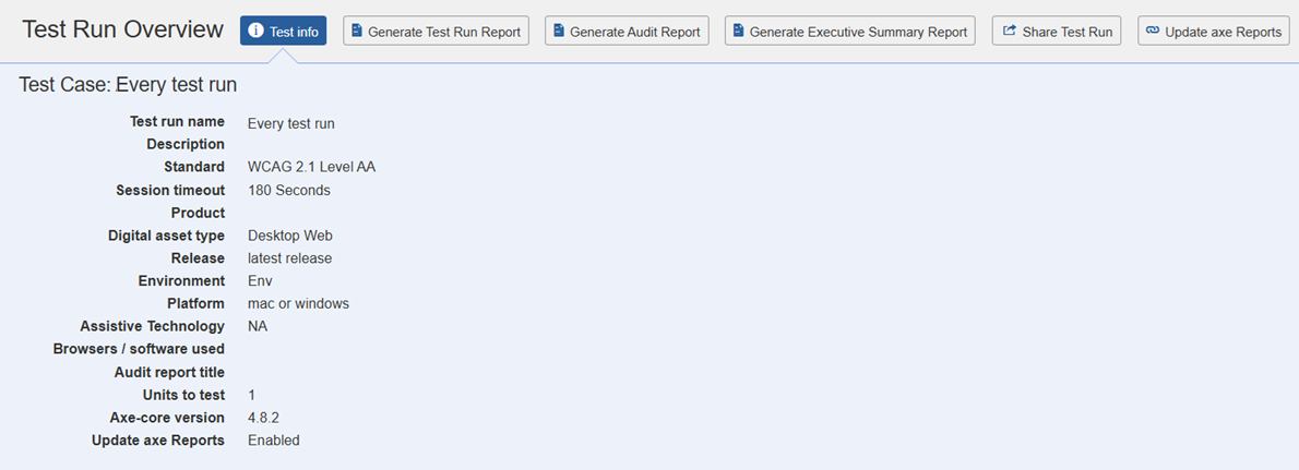 Test Info button: Expands a handy reference section of the information below that displays additional details about this Test Run, such as its Description, Standard, Session, timeout, Product, Release, Environment, Platform, Assistive technology and Units to test.