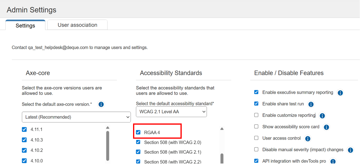 Axe Auditor now supports testing against RGAA, version 4, the official standard for digital accessibility in France. This update enables organizations operating in France to assess website compliance with RGAA guidelines directly within Axe Auditor. A new RGAA-specific template has been introduced for this standard. RGAA testing is supported only in the latest axe-core version (4.11.1) and will be included in all future axe-core releases. To perform automated test runs, users must enable the RGAA 4 option on the Admin Settings page under Accessibility Standards.