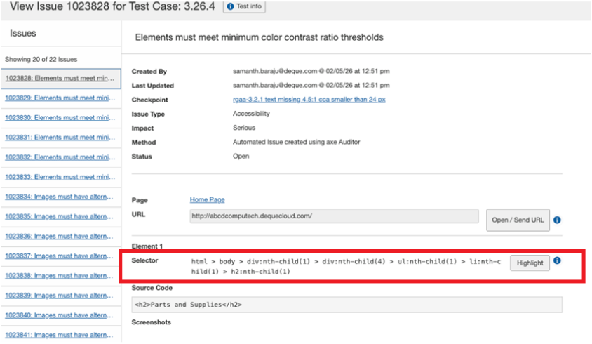 The Selector field on the Issue Details page now displays its complete value, regardless of length. Previously, long selector strings were truncated within the available display area, making it difficult to review or copy complete values during audits and user validations. The full selector is now visible directly in the interface, eliminating the need for workarounds and reducing friction during detailed issue review.