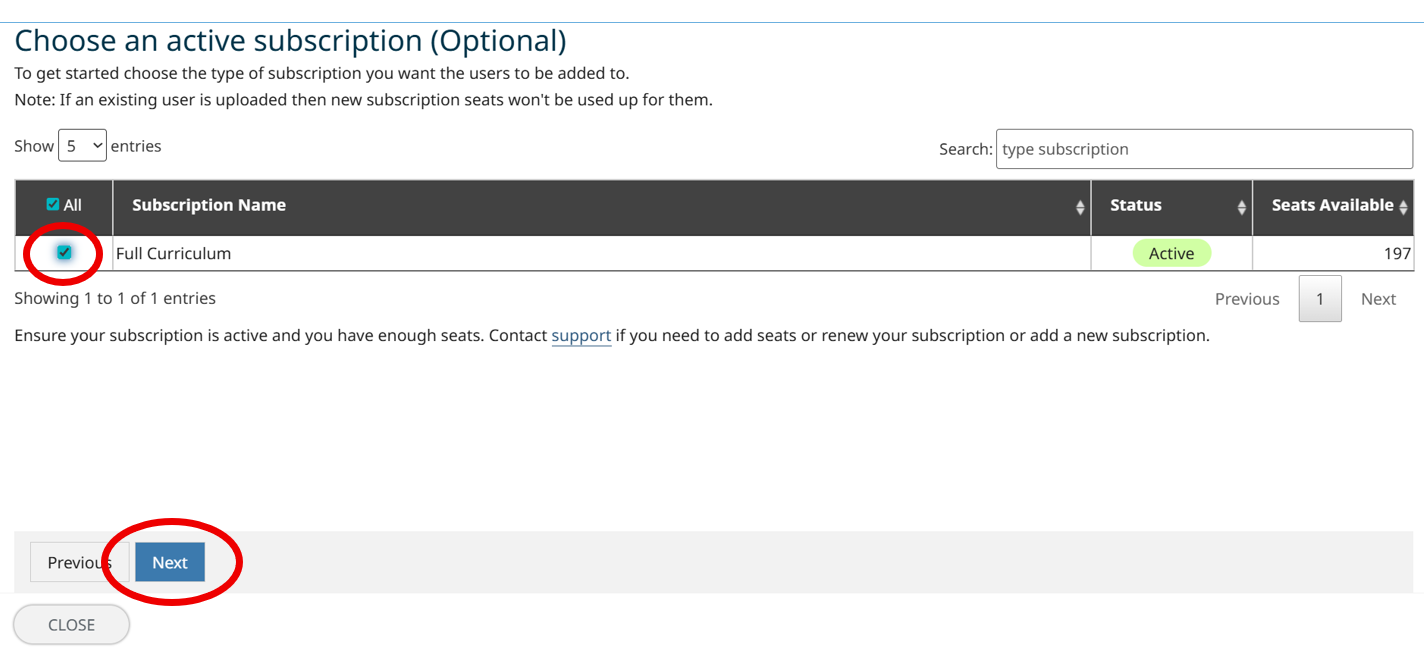 - Optional: Choose one or more subscriptions that you’d like to enroll them in. Note: this step is where you enroll users into subscriptions. In the steps that follow (using the CSV file), you can optionally add them to learning paths and/or groups. IMPORTANT: Although this step is listed as optional, you MUST enroll users into at least 1 active subscription in order for them to have course access. If you only enroll them into a learning path but not a subscription, they will not have course access.