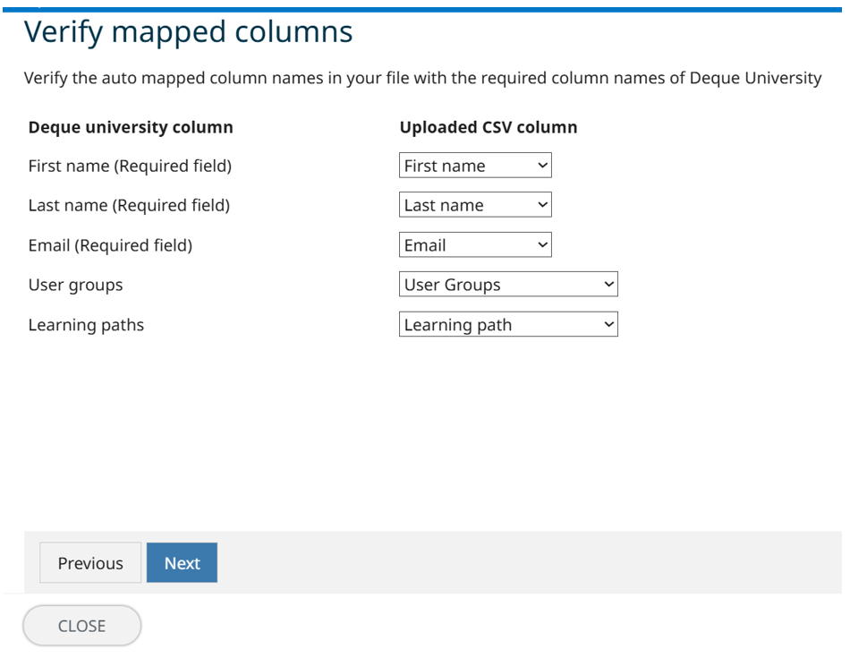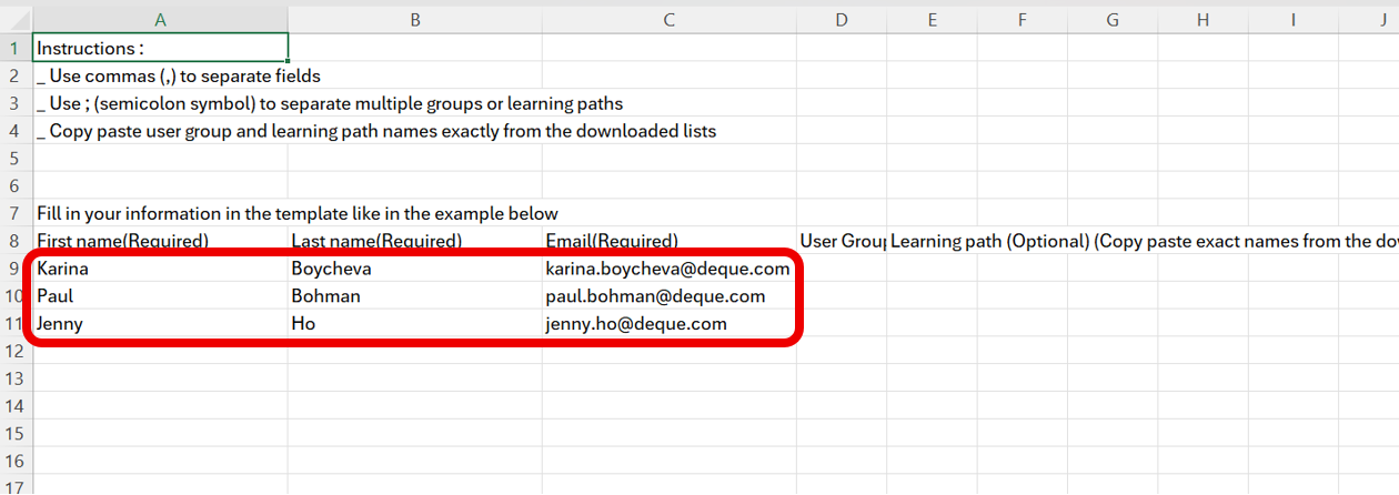- The data in columns A, B, and C is required (first name, last name, email address). The data in columns D and E is optional (User groups, Learning path). Note that multiple learning paths and/or groups can be assigned to a user at once. Use semicolons to separate them. For example: path1;path2
