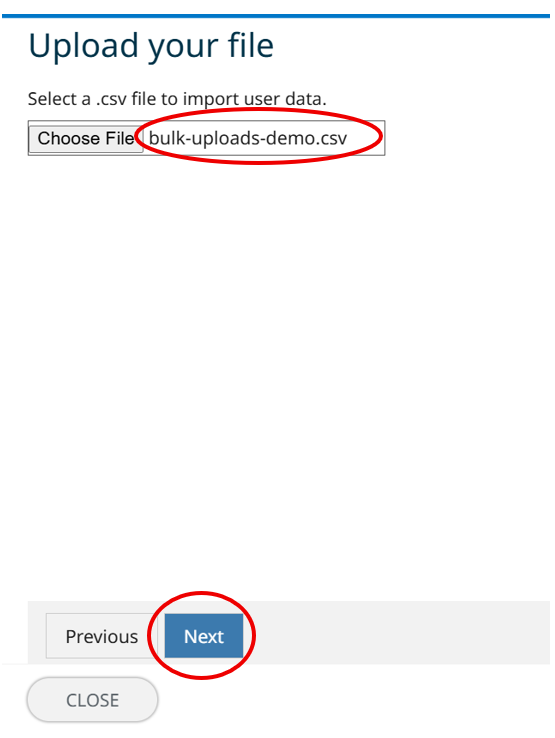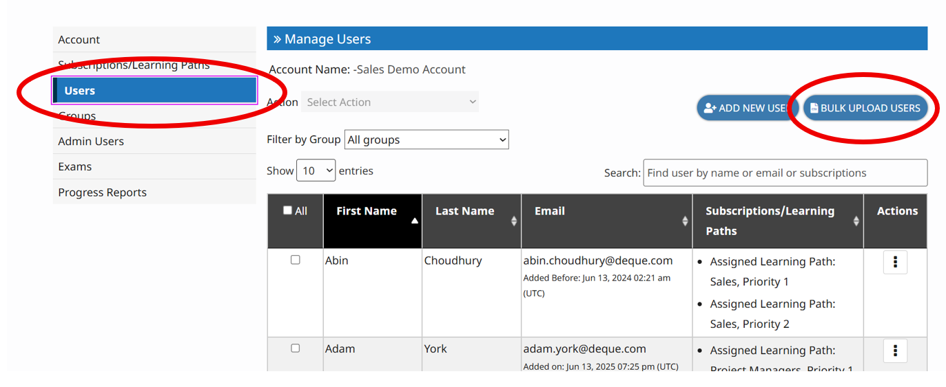 The bulk upload feature allows you to add a batch of users all at once, rather than manually one by one. With a single file upload, you can add users to one, two, or all three of the following: