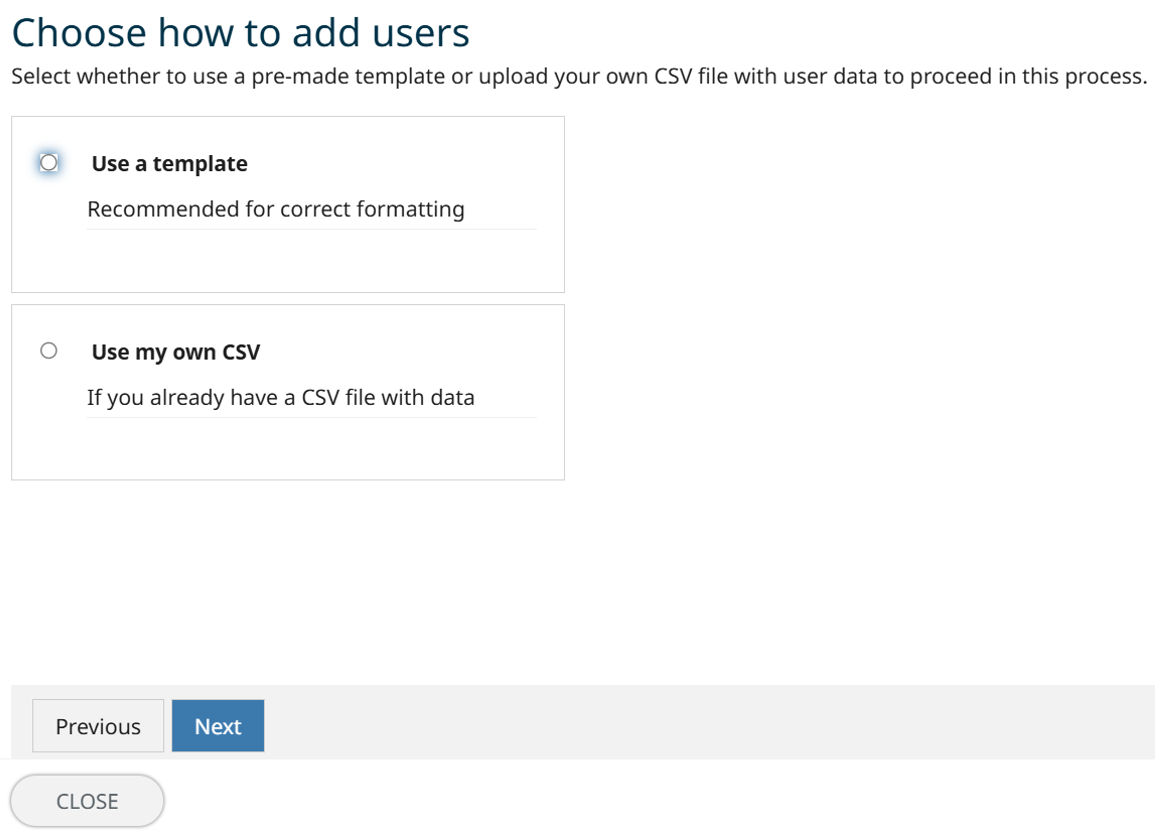 - Select Use a template or Use my own CSV. Follow the steps on screen for the option you selected.