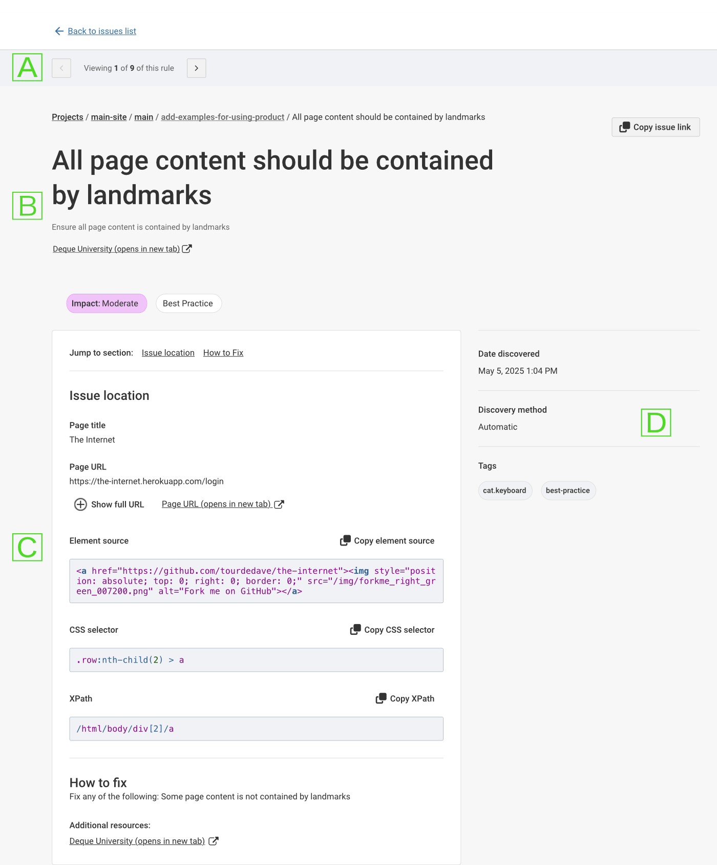 On the right side of the page (annotated as 🄳), you can find information about the time the error was discovered, the method used to locate it (here Automatic), and the accessibility tags that cover the issue.