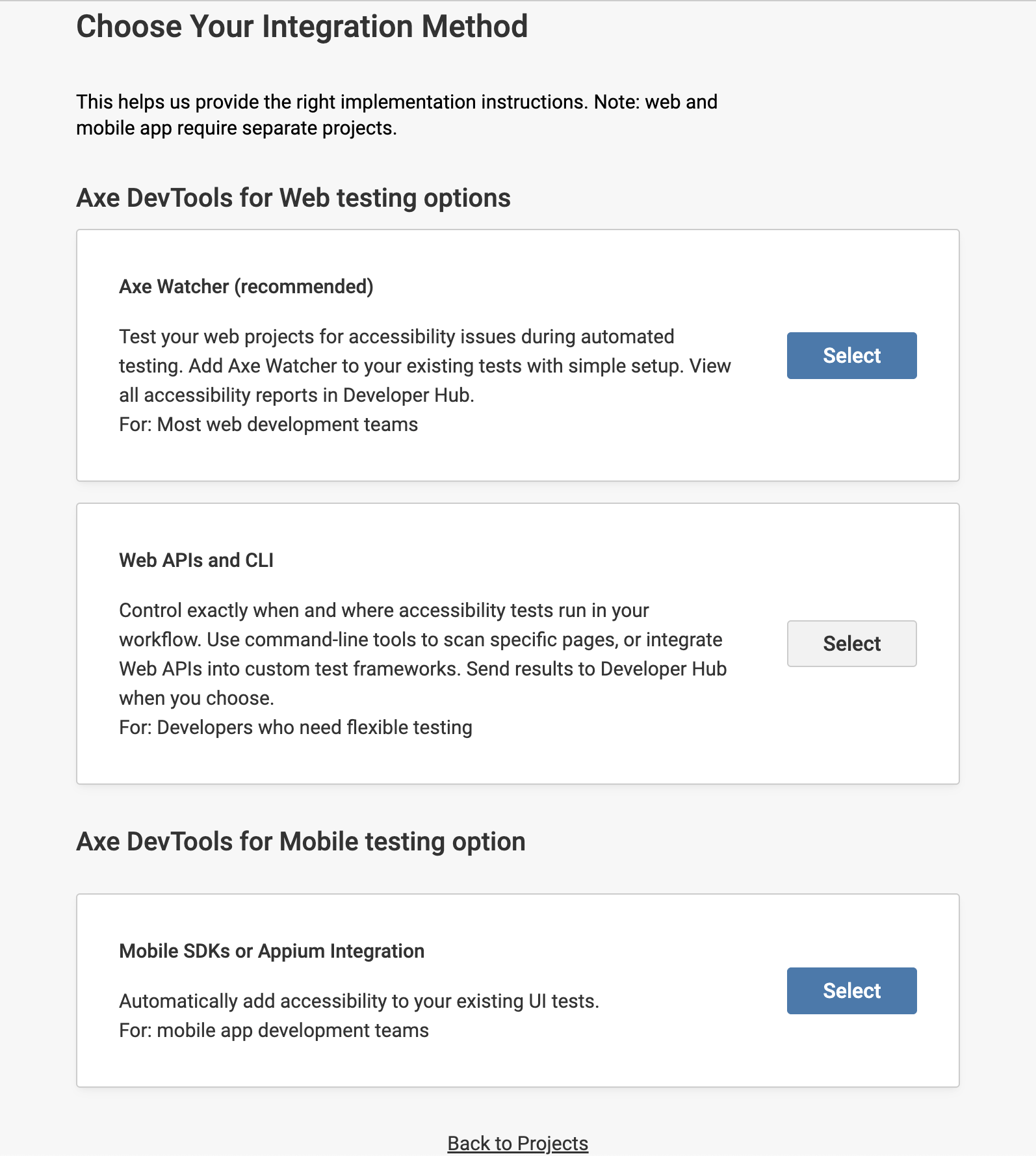 Select an integration method for gathering accessibility data. Note: You will see options only for the integration methods you have a valid license for. You need an Axe Developer Hub license for Axe Watcher, Axe DevTools for Web APIs and CLI. You need an Axe DevTools for Mobile license for mobile projects.