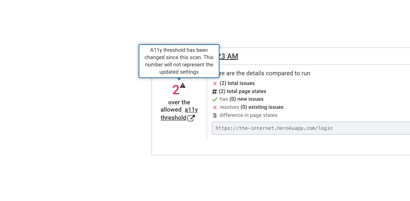 Si vous modifiez l'un des critères du seuil a11y, la modification affecte uniquement les calculs à venir et non les calculs passés ; les valeurs de seuil a11y plus anciennes ne sont pas recalculées. Une icône apparaîtra à côté du calcul pour indiquer que la configuration a changé, et si vous passez votre curseur dessus, vous serez rappelé que le seuil a changé :