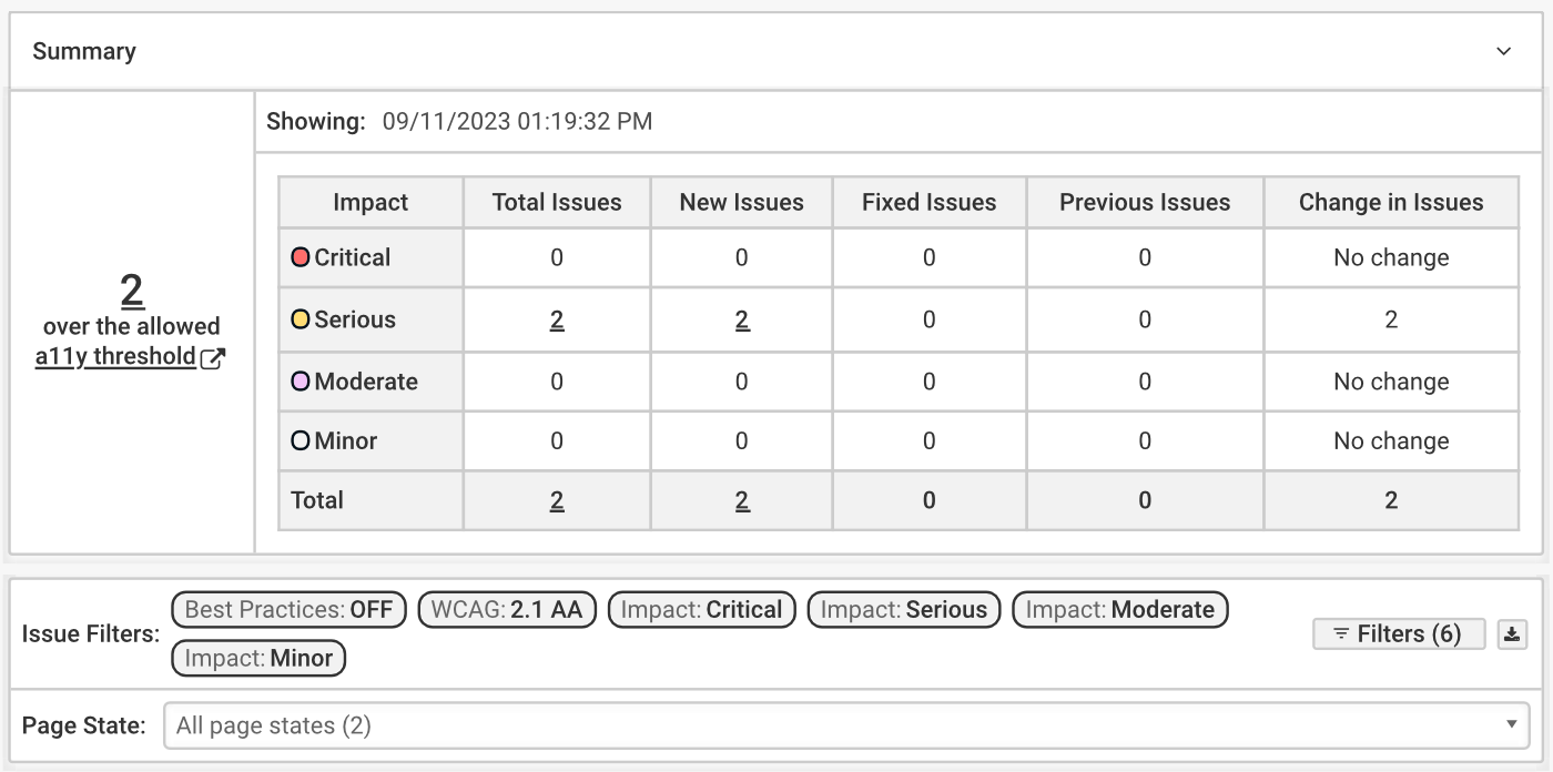 En cliquant sur la valeur du seuil a11y (ici, 2), les impacts sont ajoutés au filtre, ce qui vous permet d'accéder uniquement aux problèmes qui ont entraîné le dépassement du seuil a11y. (Dans ce cas, cliquer sur 2 a ajouté tous les impacts au filtre car tous ont été définis dans la configuration a11y.)