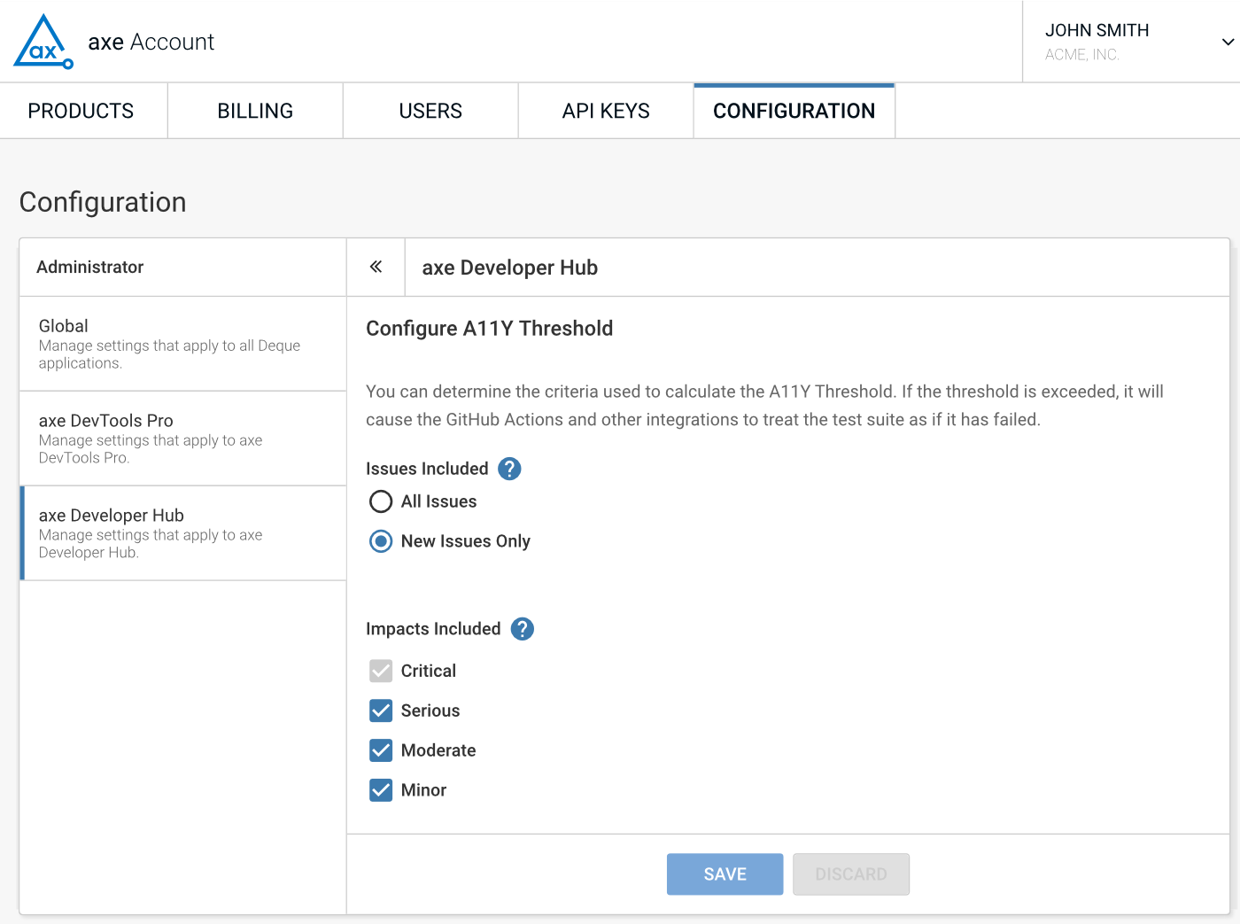 Les titulaires de compte individuels peuvent modifier les critères de seuil a11y, mais si vous faites partie d'une entreprise, vous devez être un administrateur d'entreprise pour les modifier.