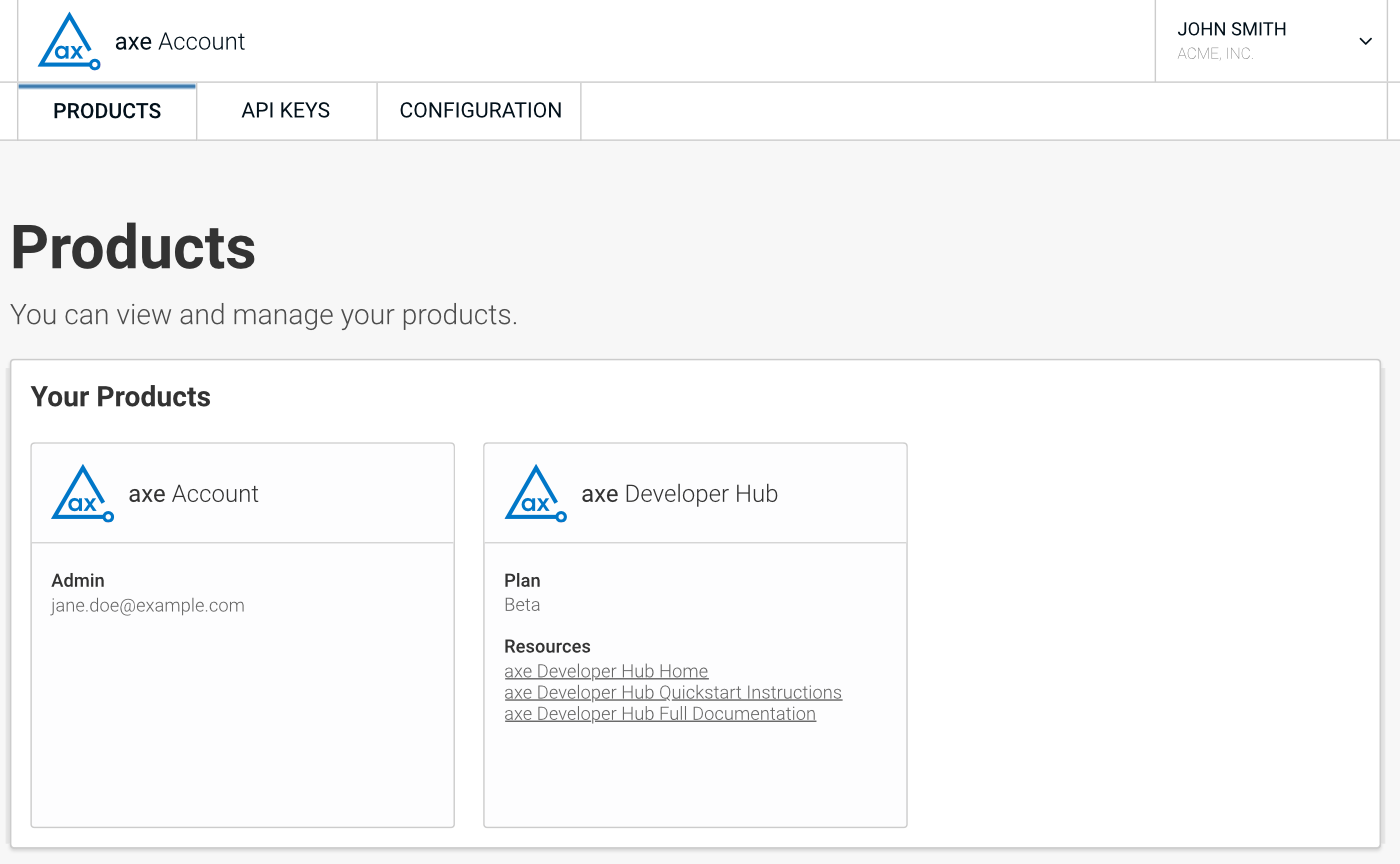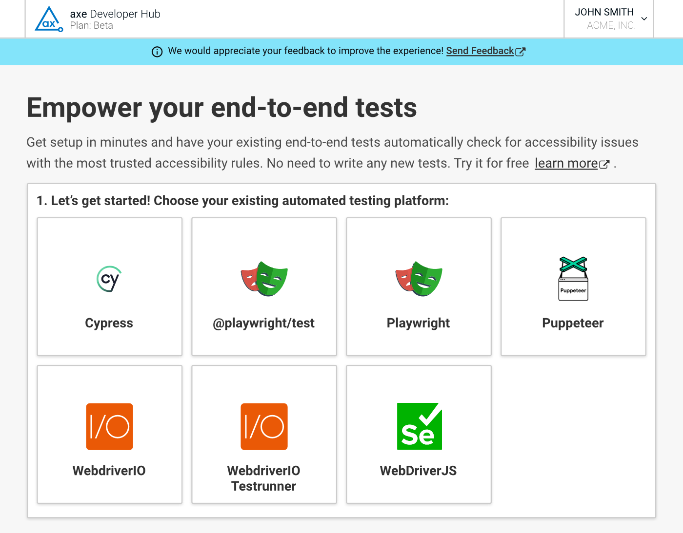 Vous devriez voir un panneau pour axe Developer Hub. Si ce n'est pas le cas, vous pouvez démarrer un essai gratuit. Consultez Commencer à utiliser axe Developer Hub pour plus d'informations.