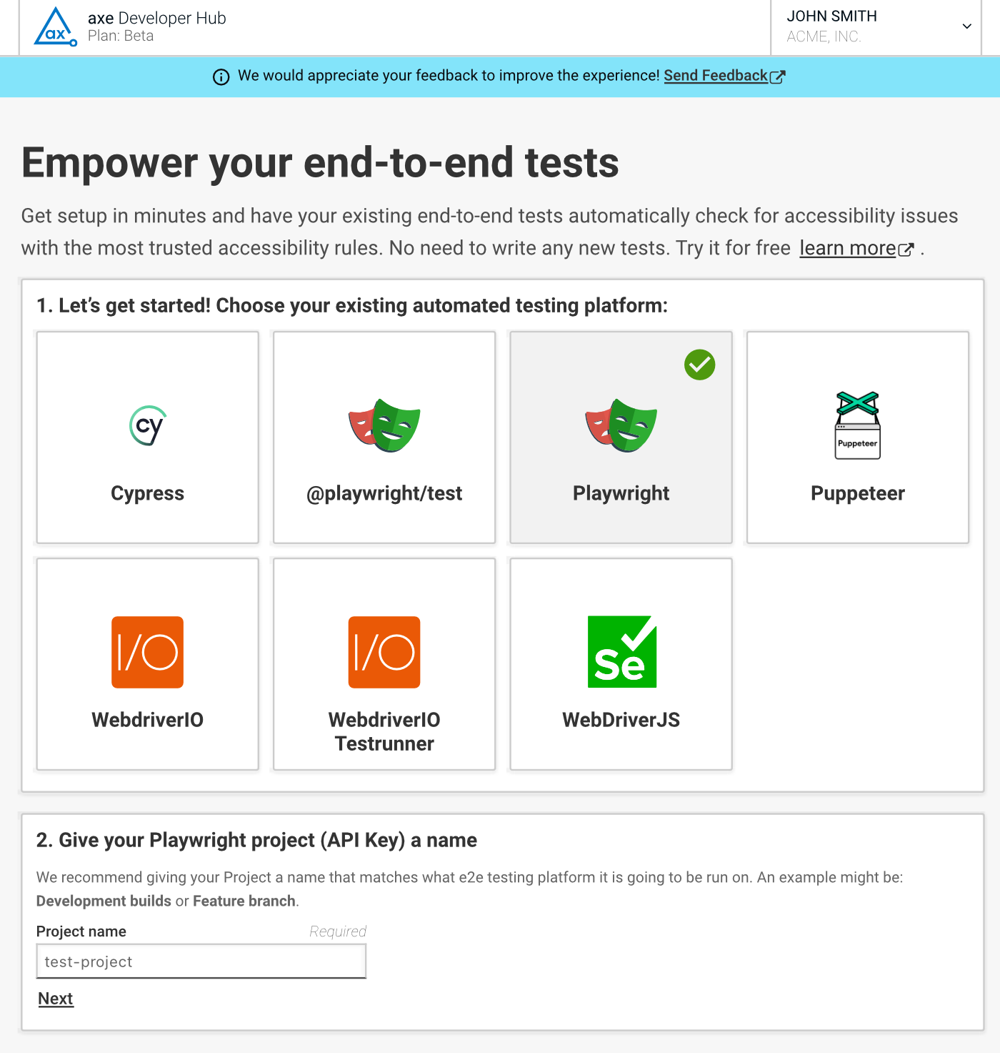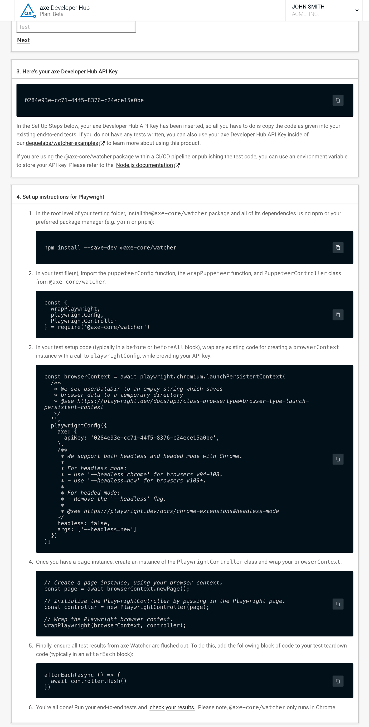 Après avoir cliqué sur Suivant, vous êtes présenté avec la clé API de votre projet, des instructions et des extraits de code pour ajouter des tests d'accessibilité à votre infrastructure de test. La manière d'utiliser les extraits de code est décrite avec chaque extrait, et vous pouvez cliquer sur l'icône de copie pour copier cet extrait dans le presse-papiers.