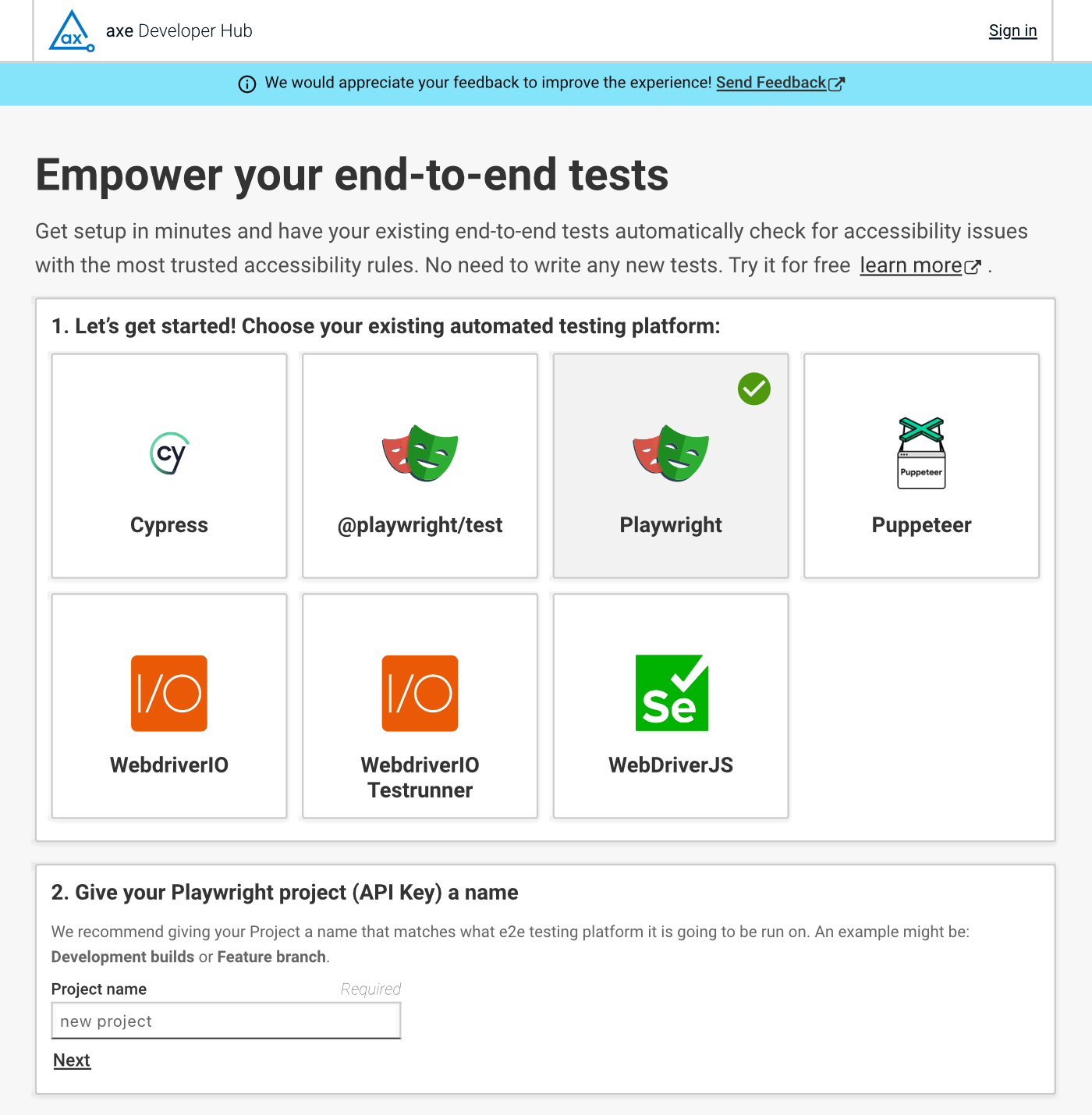 Maintenant que vous avez nommé votre projet, vous devrez peut-être créer un compte axe et démarrer un essai gratuit ou demander à l'administrateur de votre entreprise de démarrer un essai gratuit :