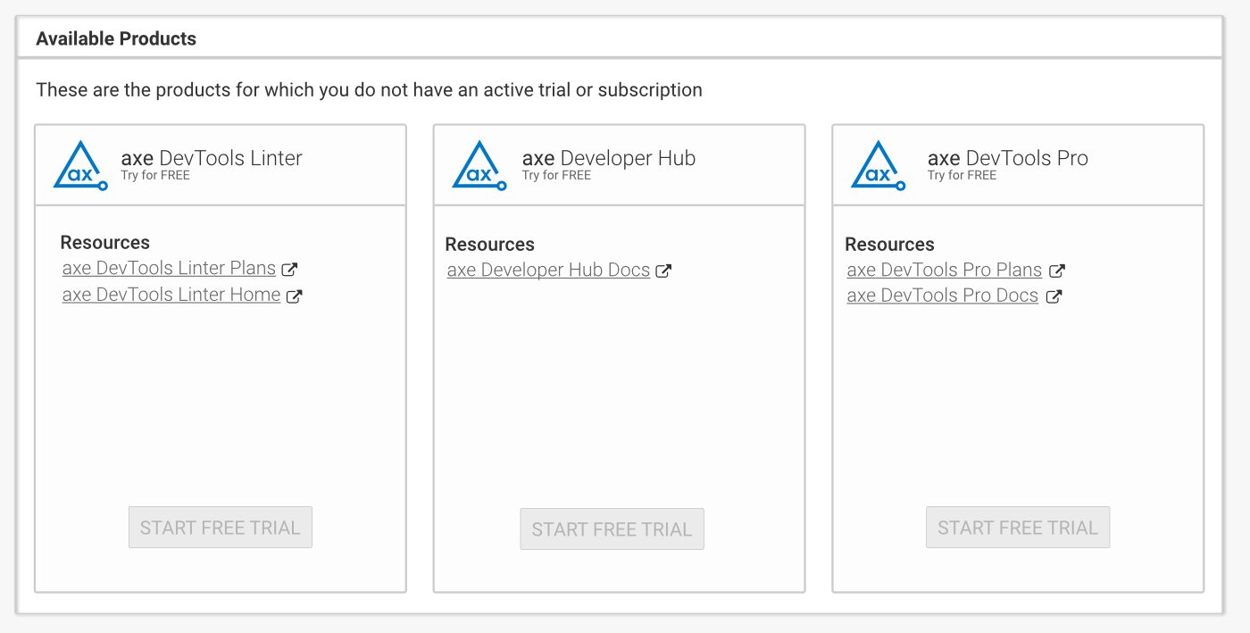 Si vous possédez déjà un compte axe ou êtes un administrateur d'entreprise, vous pouvez démarrer un essai gratuit d'axe Developer Hub à partir de la page des produits en cliquant sur le lien DÉMARRER L'ESSAI GRATUIT (sur la carte axe Developer Hub) comme indiqué ci-dessous :