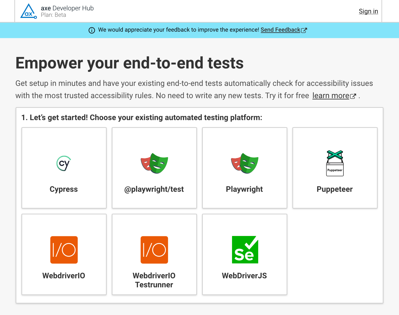 - Consultez Support des plates-formes pour plus d'informations sur les plates-formes d'automatisation du navigateur et les navigateurs pris en charge par axe Developer Hub.