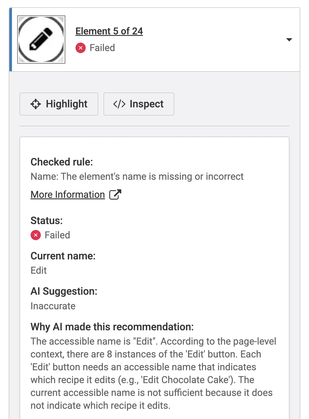 - Provide corrections: When AI makes errors, correct them to ensure accurate results—this helps maintain the integrity of your accessibility testing program