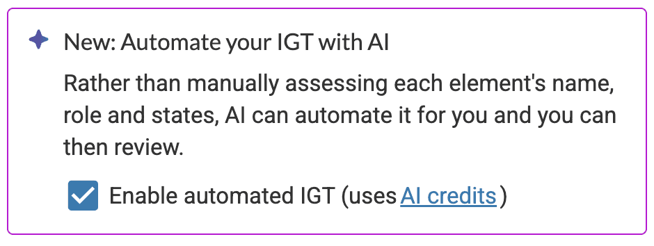 The Interactive Elements IGT is the first IGT to support being automated. In this IGT, AI automatically assesses the accessible name, role, and state of interactive elements on your page.