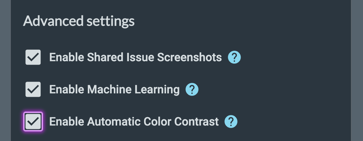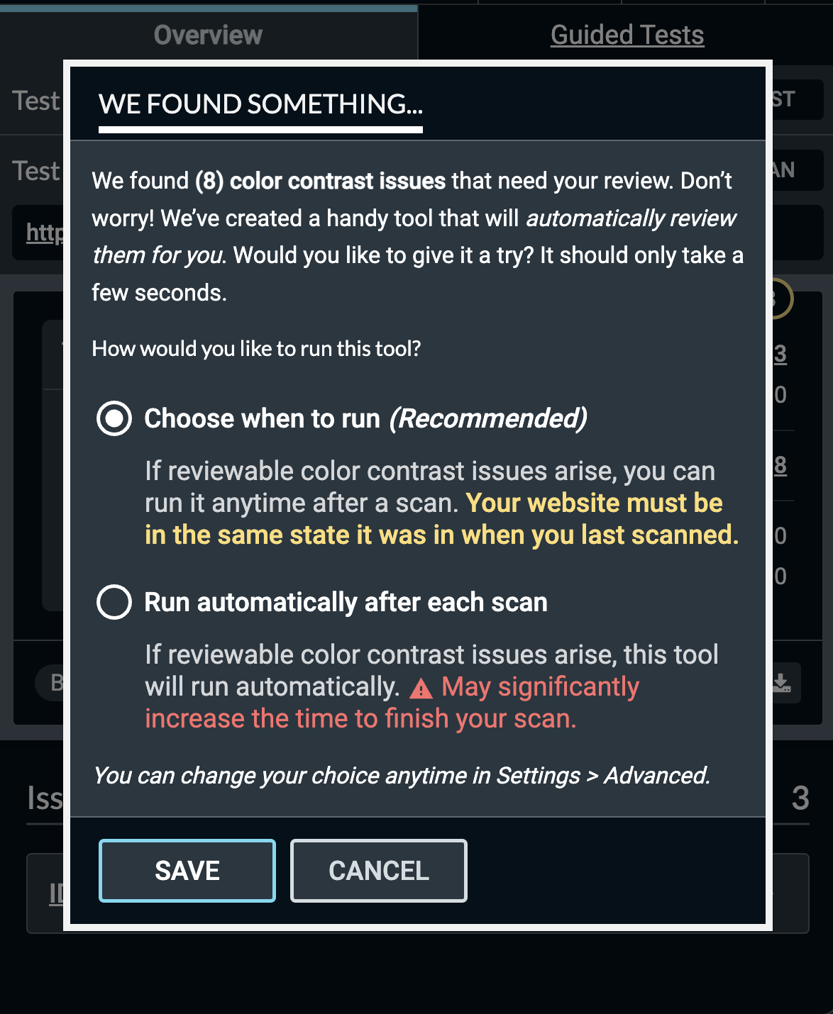 The first time users with the Pro plan run a scan which has “needs review” color contrast issues (“Elements must have sufficient color contrast”), a dialog will appear which informs them of this new feature. They can then choose how this new feature will run: