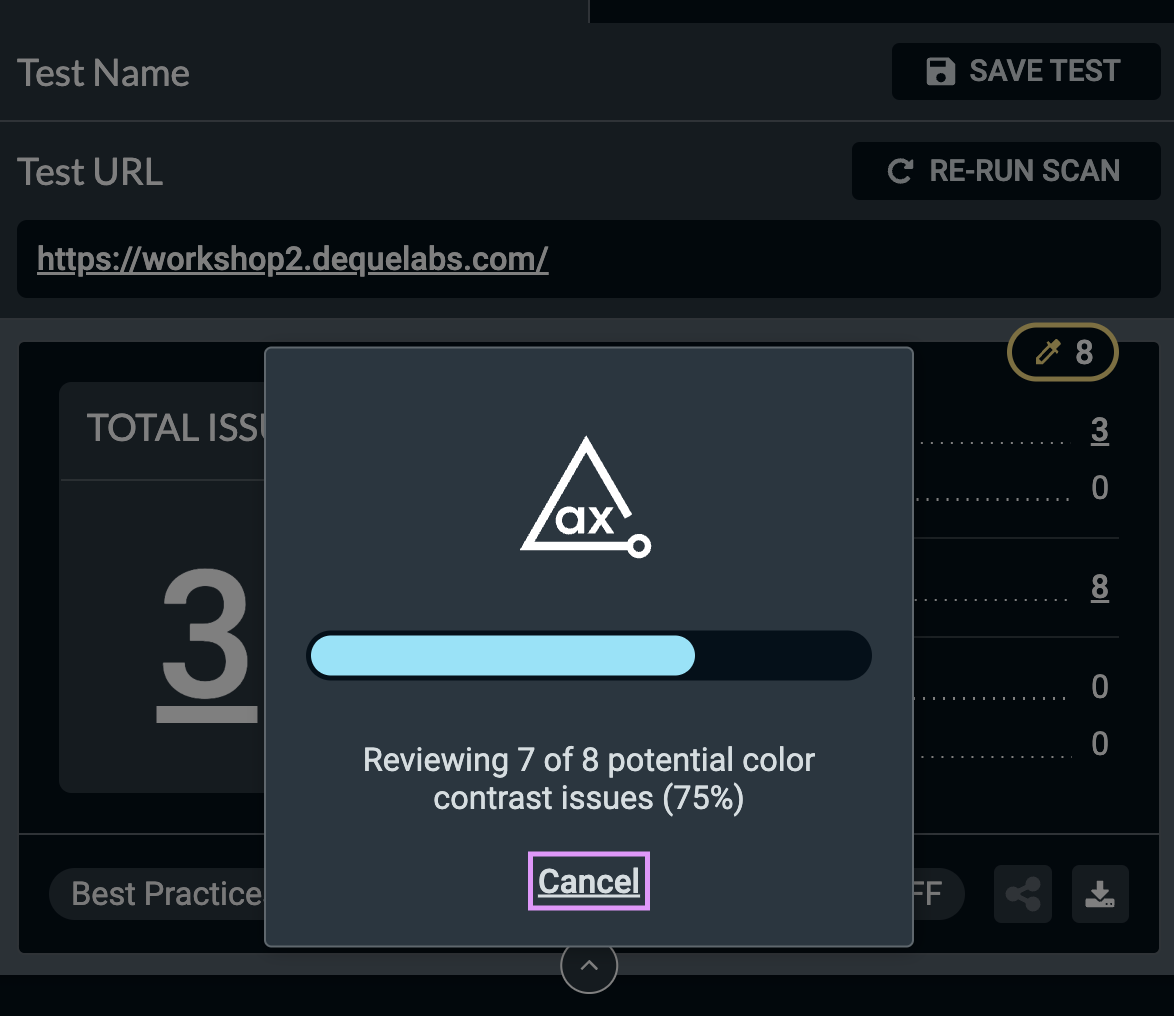 Users can opt in to having the tool run automatically after each scan completes. This may significantly increase the time it takes to finish each scan. In this mode, the color contrast tool will kick off immediately after the automatic scan completes.