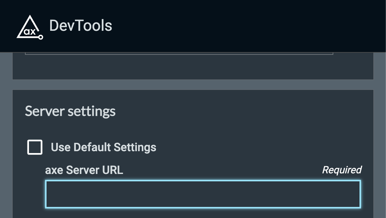 - Enter your private cloud DevTools server URL (included in your welcome email) in the "axe Server URL" input