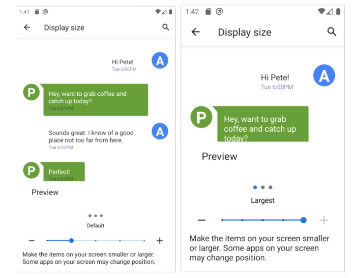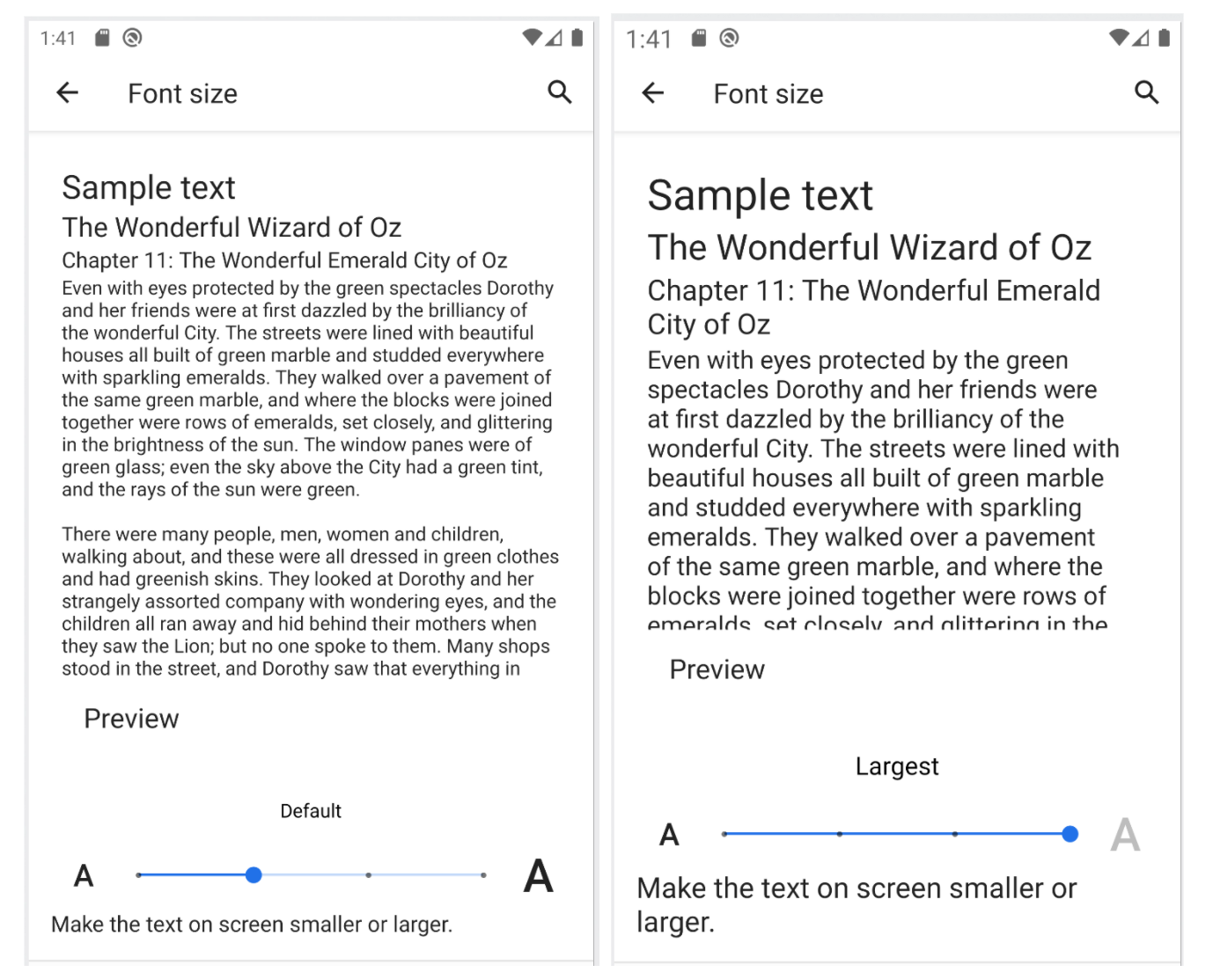 Android applications must scale content to ensure no loss of information or functionality for users requiring larger font sizes to conform to WCAG 1.4.4 Resize Text. Information should be made available to everyone. This guide will cover recommended ways to support scaling text to ensure the user experience is suited for everyone.