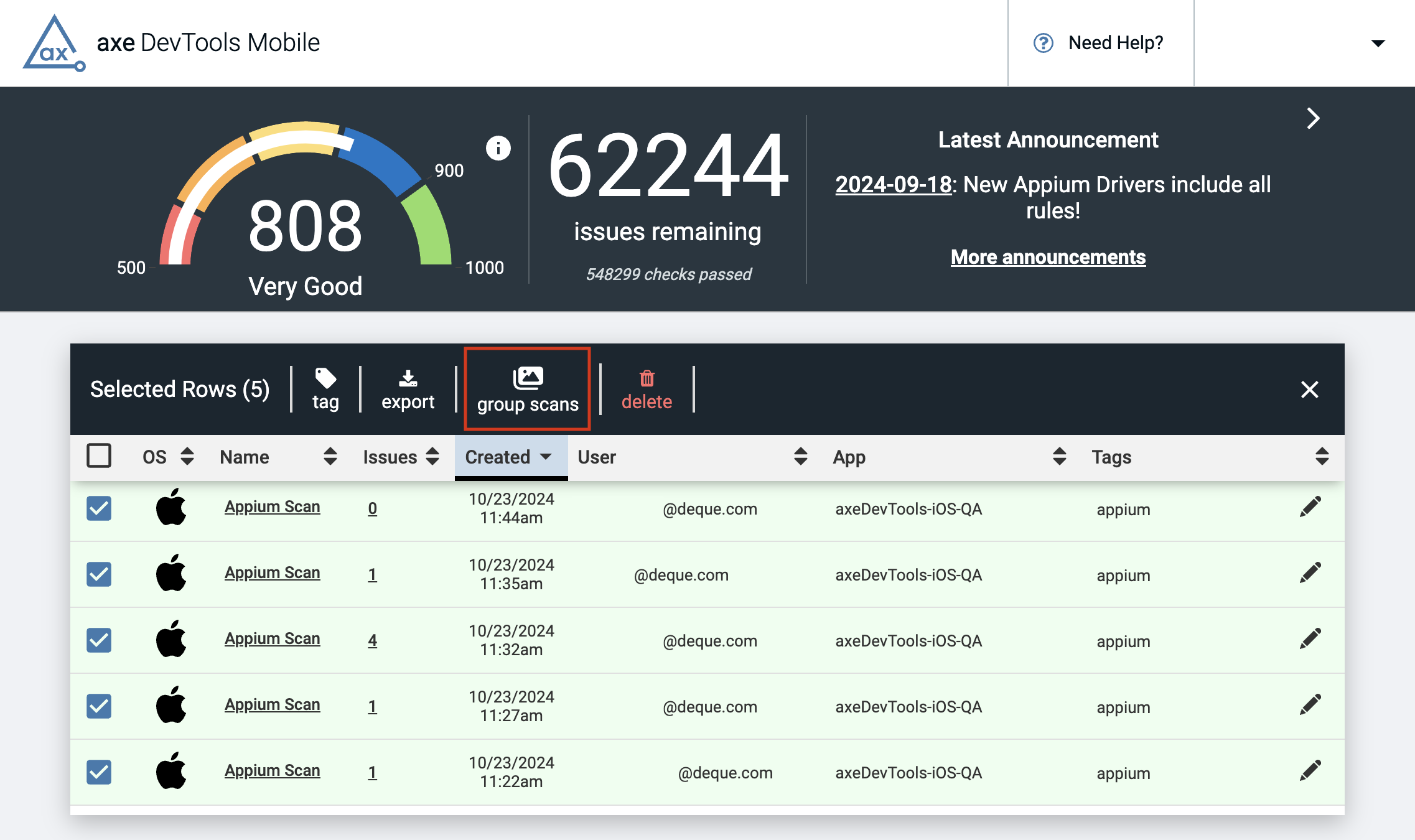 This feature allows you to view and analyze results for a group of scans in aggregate, rather than reviewing scans individually. You can sort and prioritize issues across multiple scans such as those from a test run, a release, or a specific team.